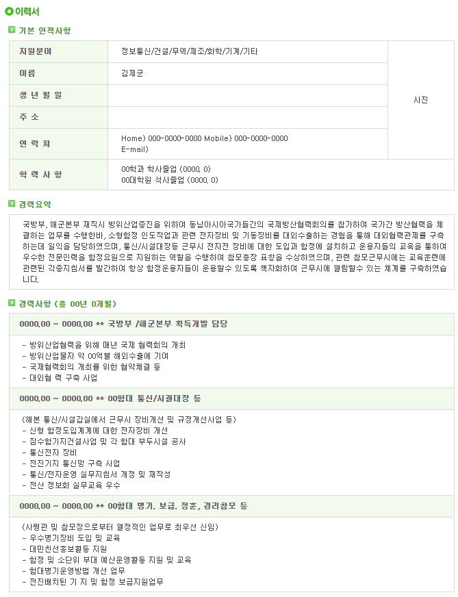 [제대군인지원센터] 해군 장교 비전투병과 이력서 샘플 (정보통신/건설/무역/제조/화학/기계/기타)