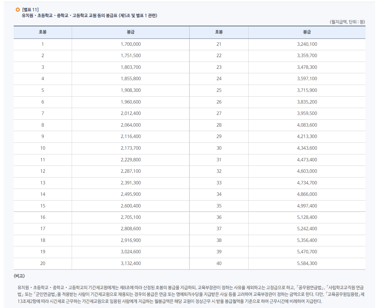 [공무원 봉급표] 2022년도 유치원ㆍ초등학교ㆍ중학교ㆍ고등학교 교원 등의 봉급표 (제5조 및 별표 1 관련)