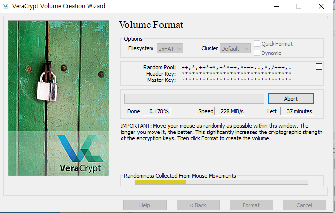 저는 Serpent(Twofish(AES)) 와 SHA-512 를 선택 하였습니다. "Next" 를 클릭 합니다.