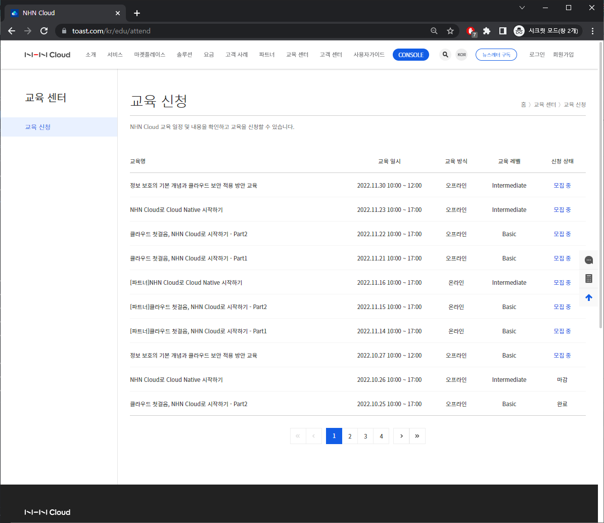NHN Cloud 에서 새롭게 홈페이지를 개편하면서 온/오프라인 교육 정보도 올렸습니다.