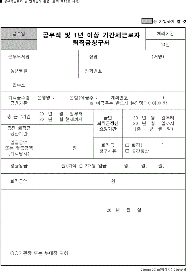 공무직 및 1년 이상 기간제근로자 퇴직금청구서