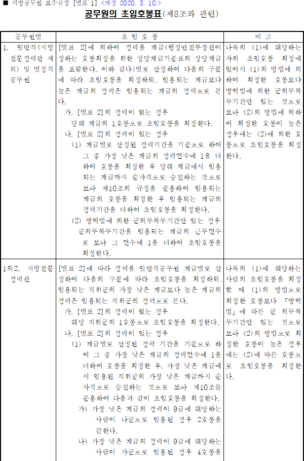 공무원의 초임호봉표(제8조와 관련)