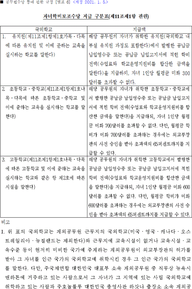 자녀학비보조수당 지급 구분표(제11조제1항 관련)