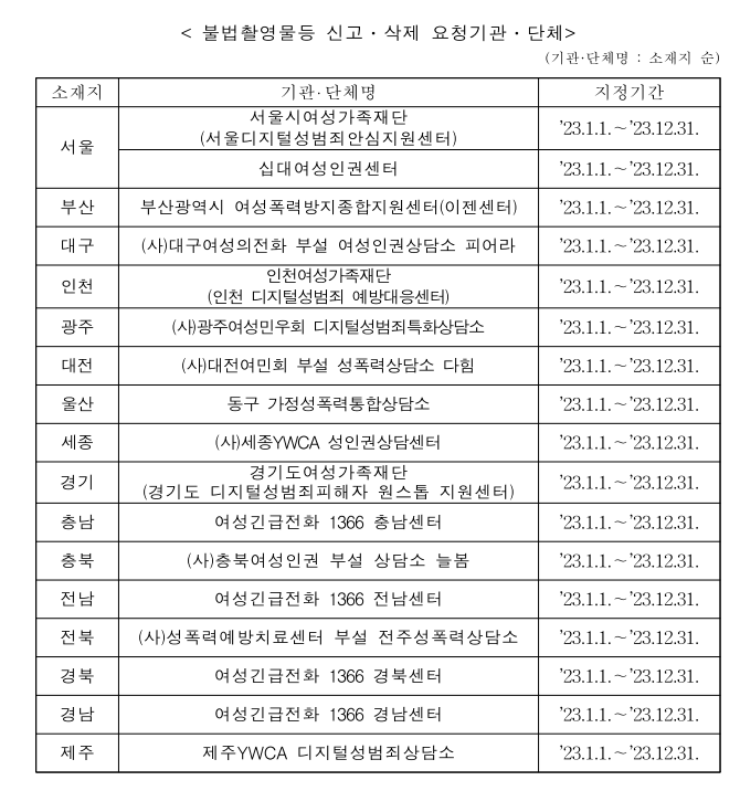 ‘불법촬영물등 신고?삭제요청 기관’은 신고를 어려워하는 피해자를 대신해 별도 지정된 기관들이 불법촬영물등에 대한 신고 및 삭제요청을 대행할 수 있도록 하기 위해 도입되었다.