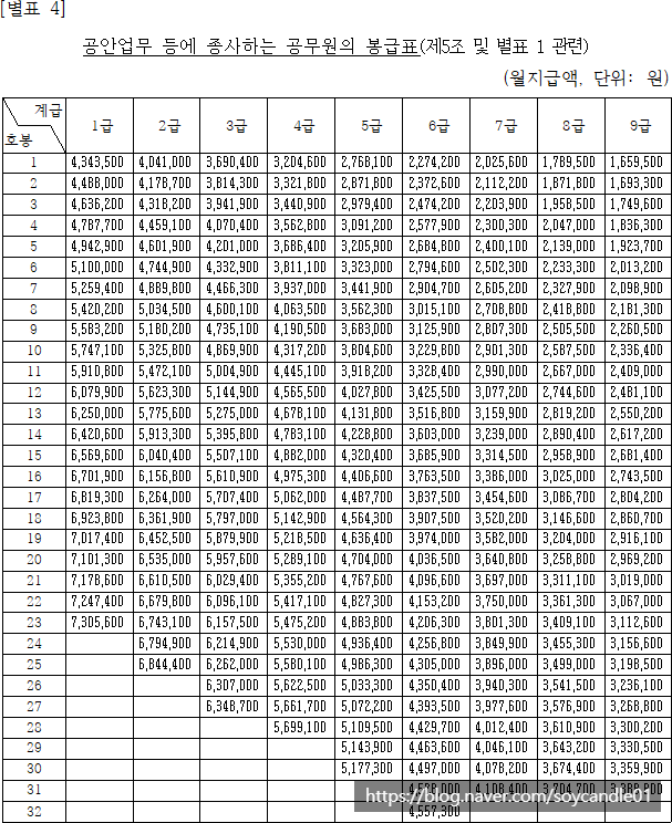| [2021년][공무원 봉급표] 경찰공무원·소방공무원 및 의무경찰 등의 봉급표 (0) | 2021.04.24 |