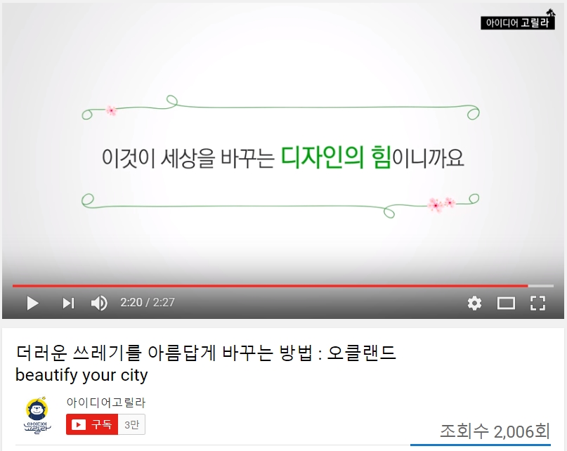 | [YouTube|아이디어고릴라|창업] 더러운 쓰레기를 아름답게 바꾸는 방법 : 오클랜드 beautify your city (0) | 2021.04.27 |