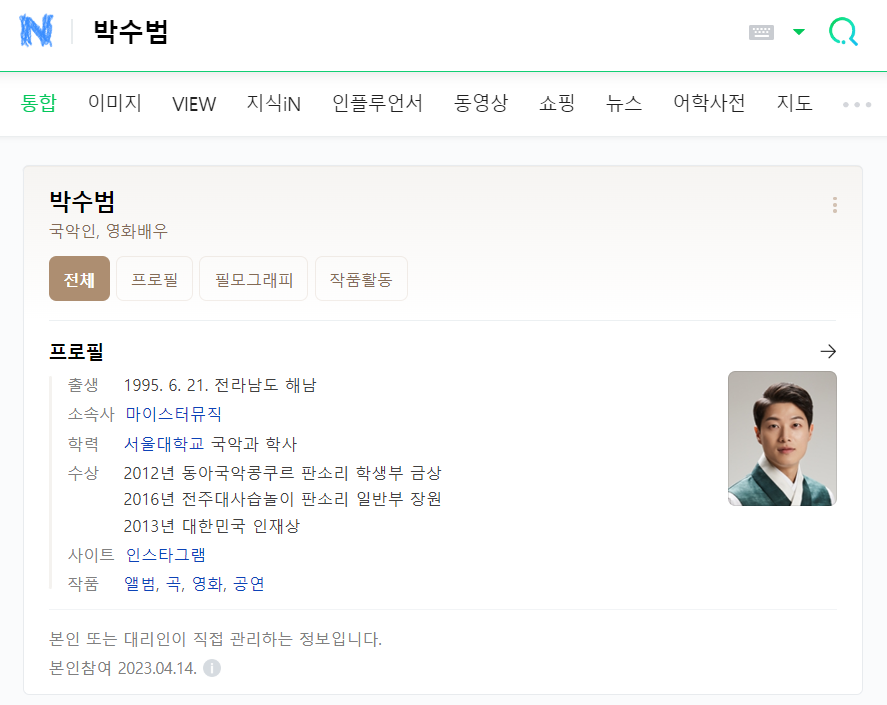 소리꾼 박수범의 프로필 입니다.(네이버 검색)