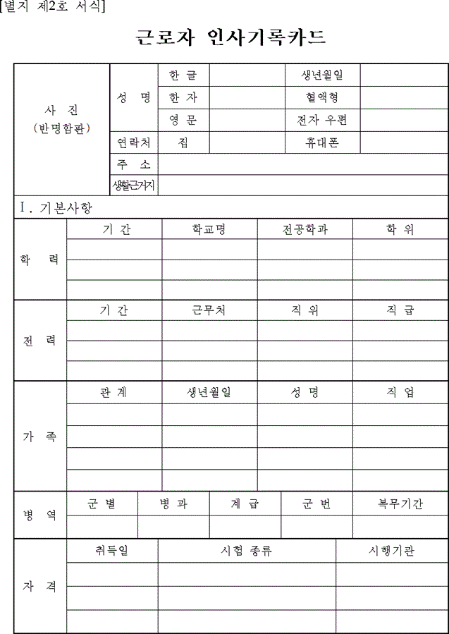 | [표준] 근로자 인사기록카드 (0) | 2022.12.03 |