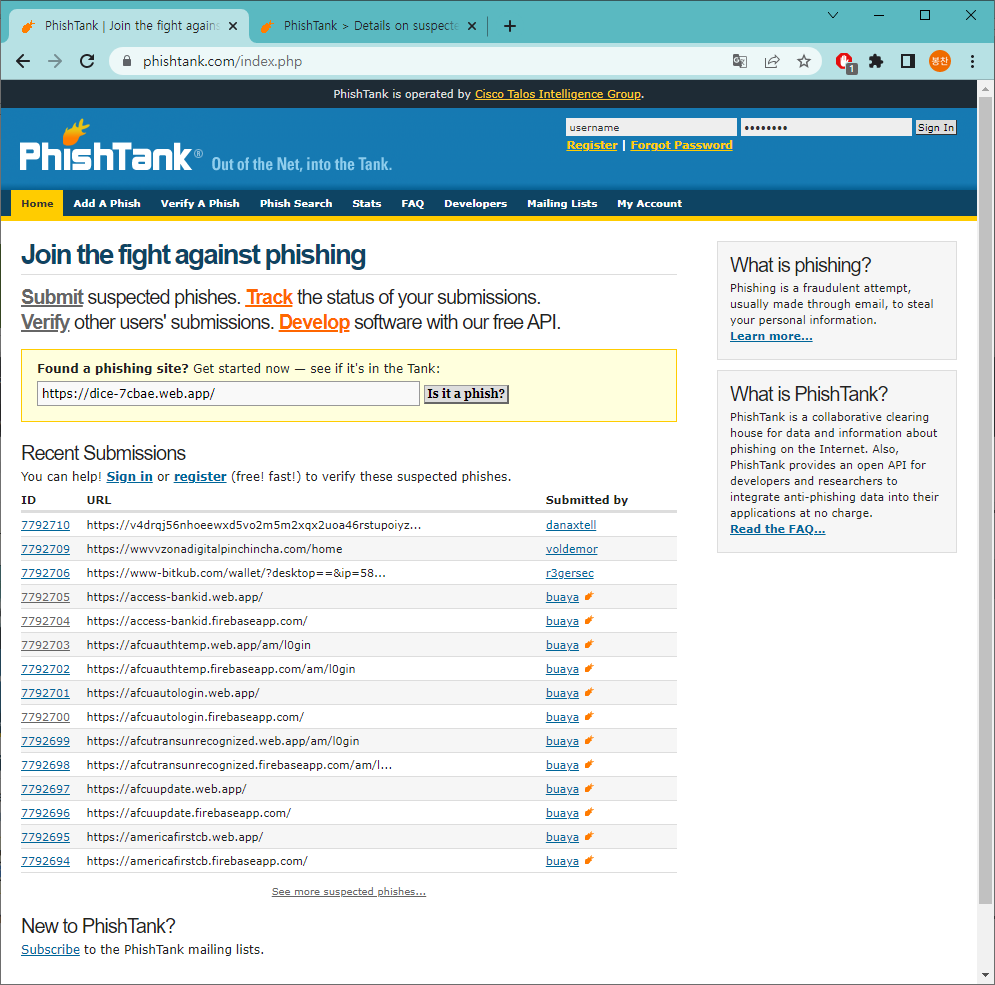 Site 바로가기 : https://www.phishtank.com/