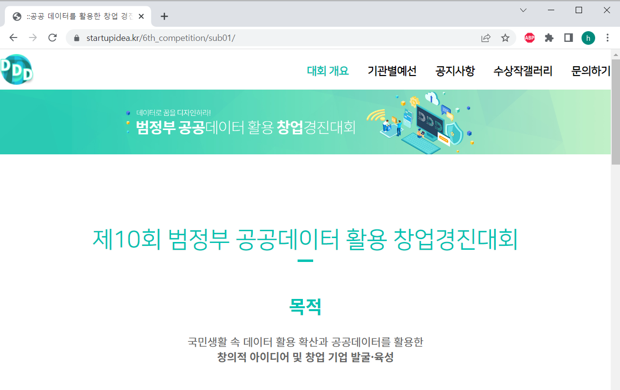 | [공모전] 제10회 범정부 공공데이터 활용 창업경진대회 (0) | 2022.05.31 |