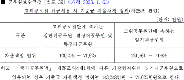 | [2023년][공무원 봉급표] 고위공무원 신규채용 시 기준급 자율책정 범위 (0) | 2023.01.13 |