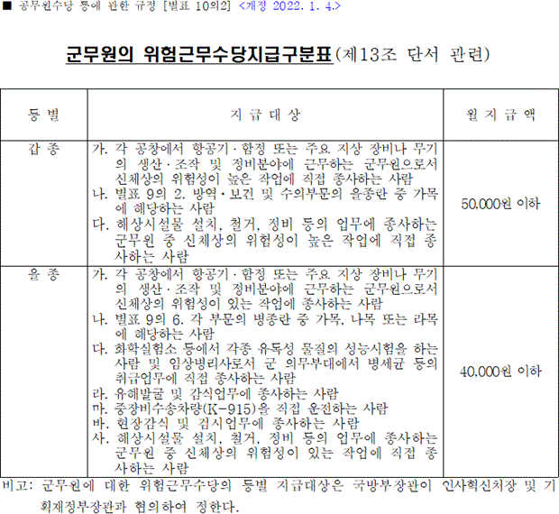 | [공무원수당] 군인의 위험근무수당 지급대상 및 지급기준 (0) | 2022.12.08 |