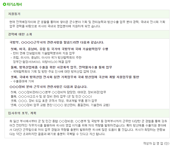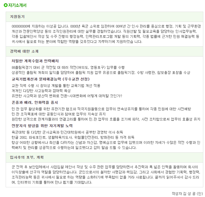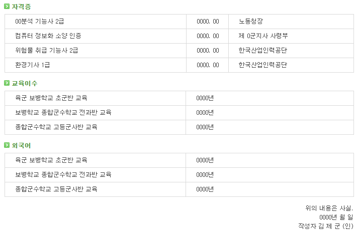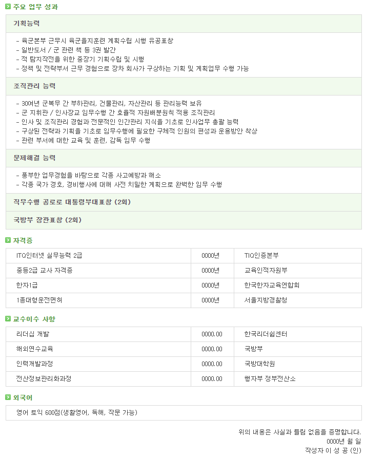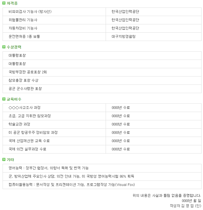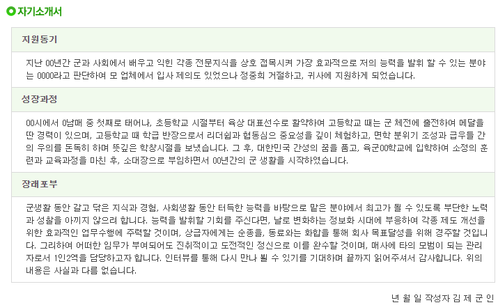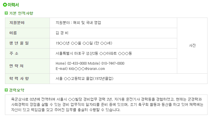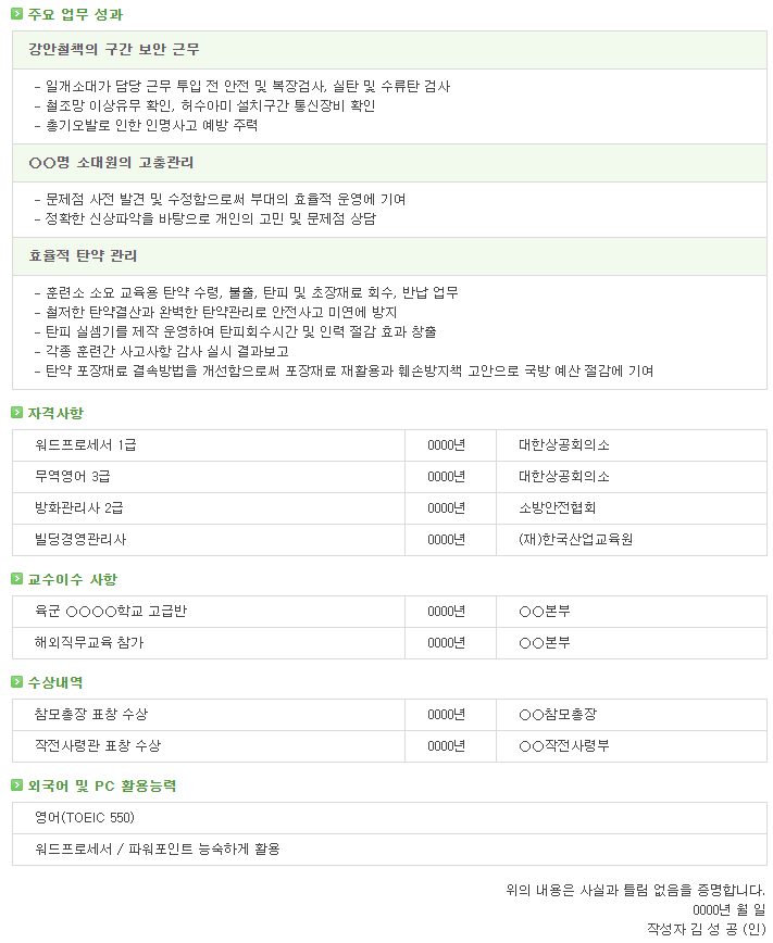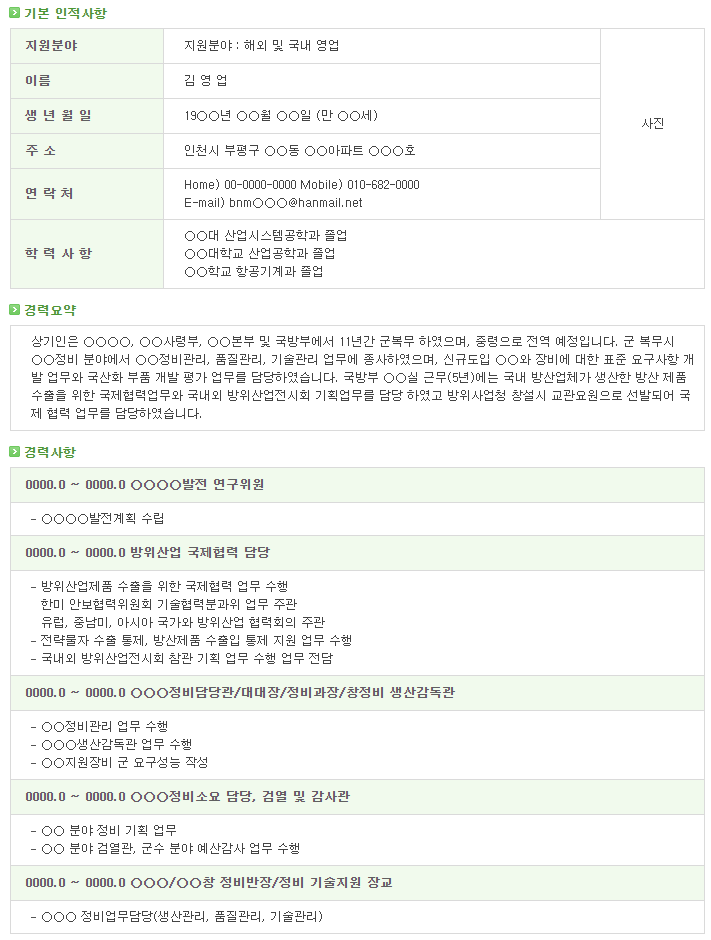 | [제대군인지원센터] 부사관 이력서 샘플 2 (0) | 2021.04.29 |