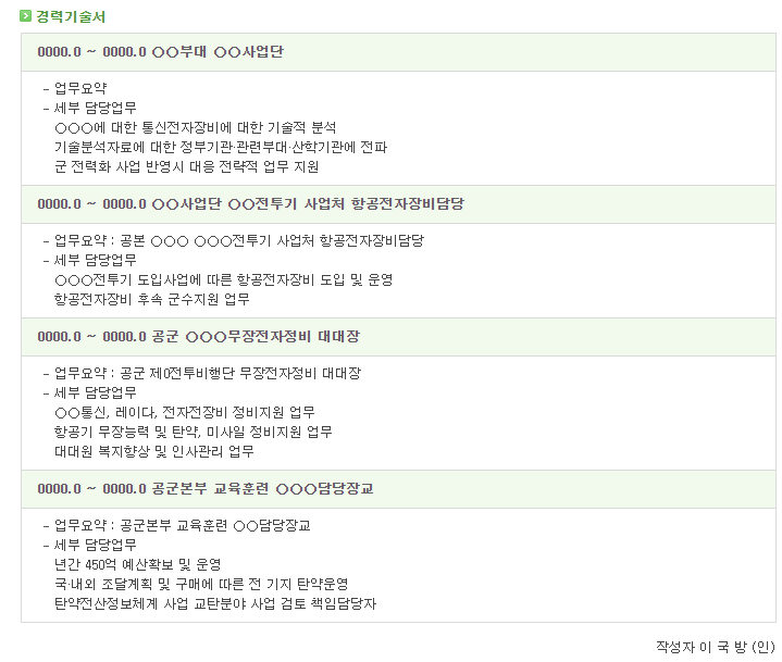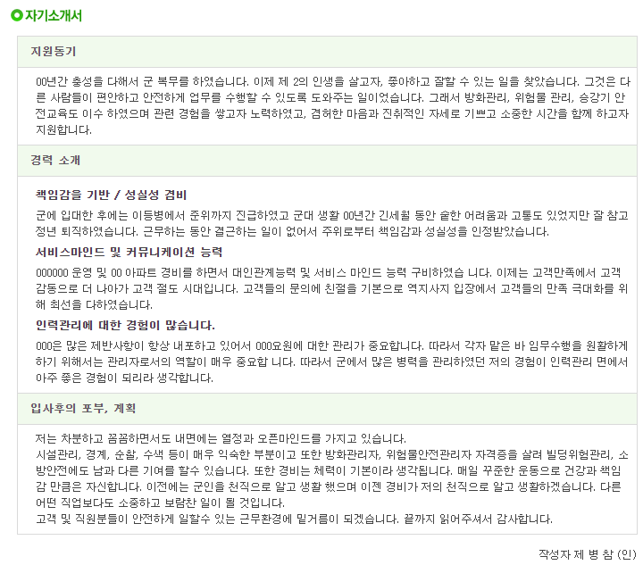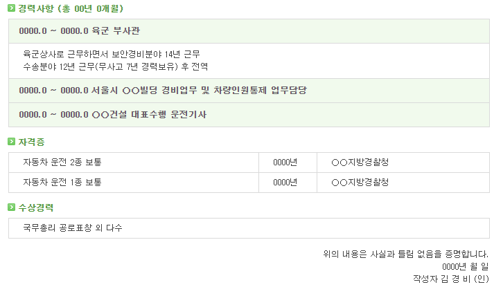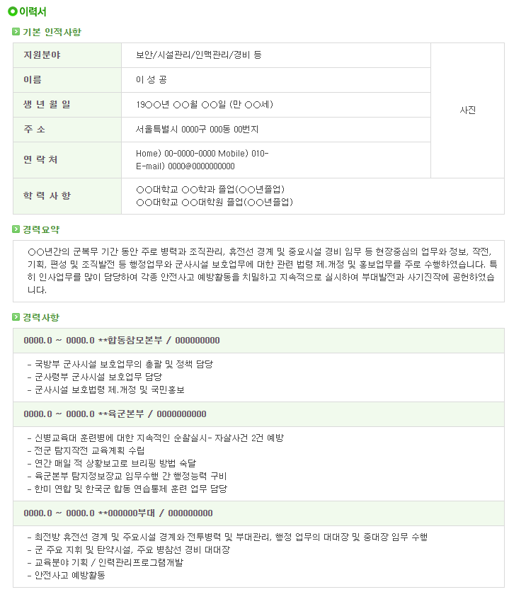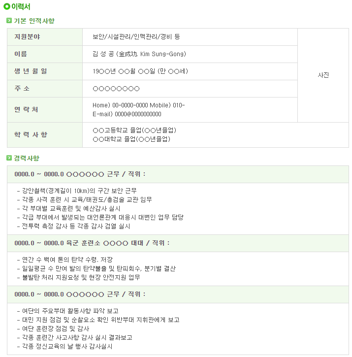 | [제대군인지원센터] 부사관 이력서 샘플 1 (지원분야 : 보안/시설관리/인맥관리/경비 등) (0) | 2021.04.29 |