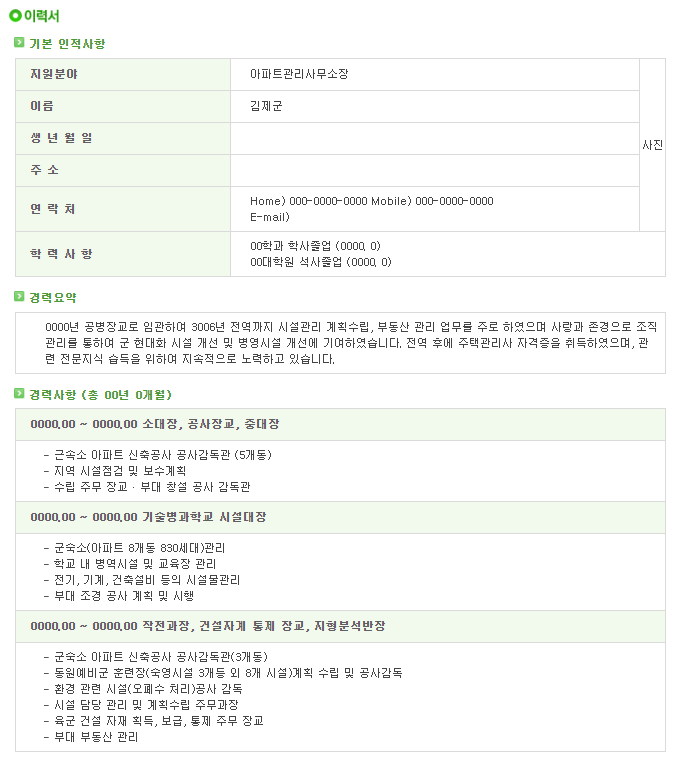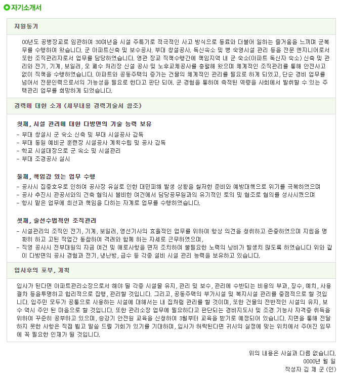 | [제대군인지원센터] 육군 전투병과 부사관 이력서 샘플 (지원분야 : 보안/시설관리/인력관리/경비 등) (0) | 2021.04.29 |
