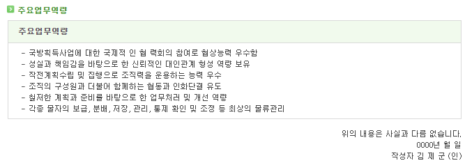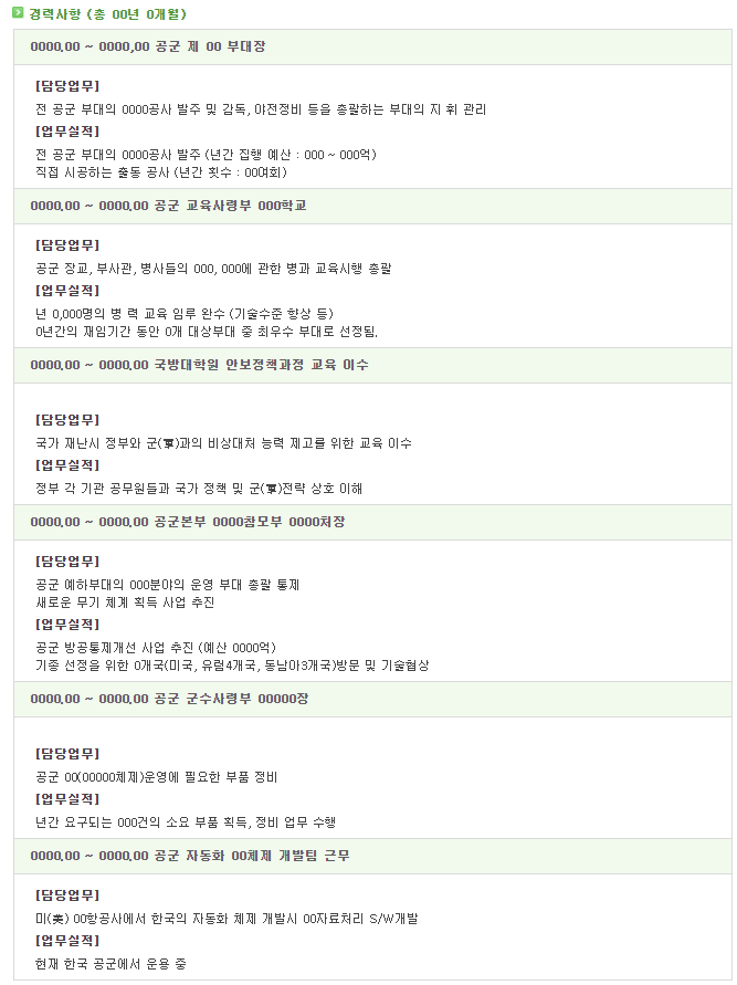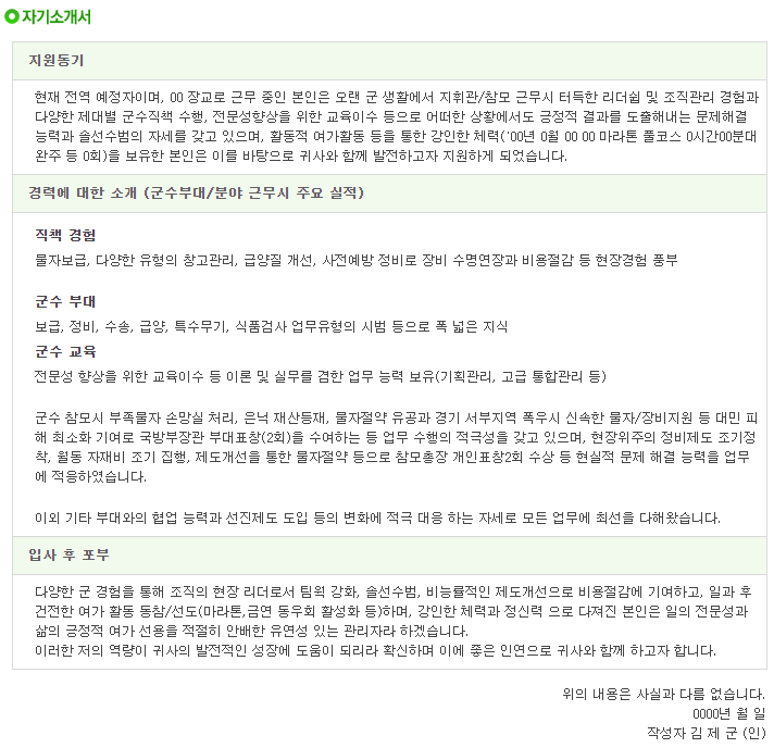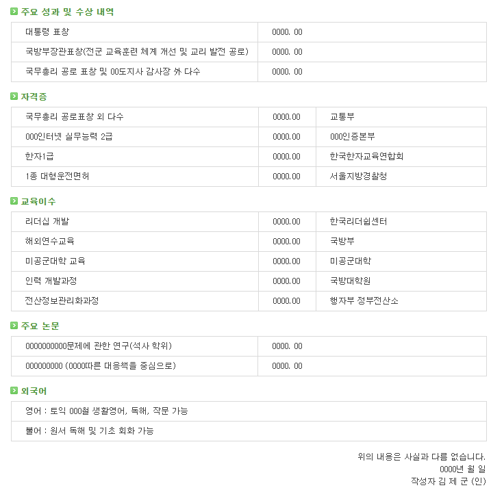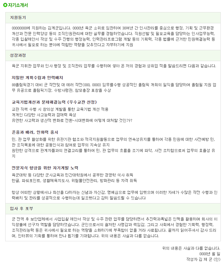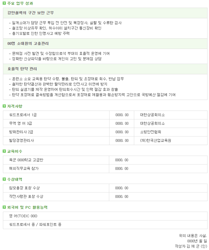 | [제대군인지원센터] 육군 전투병과 장교 이력서 샘플 (지원분야 : 기획/행정/관리/총무 등) (0) | 2021.04.29 |
