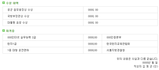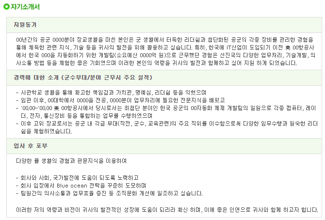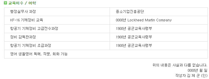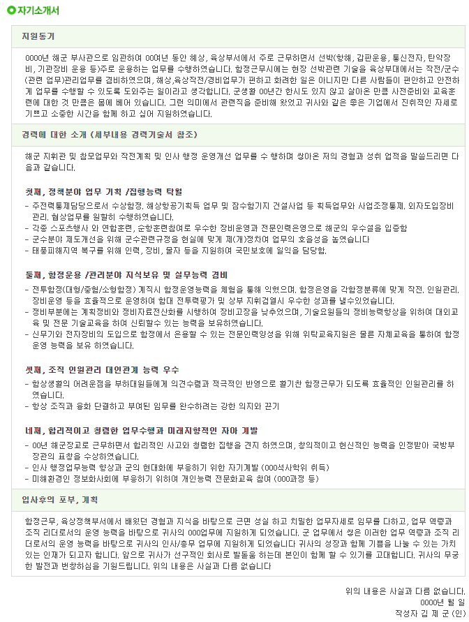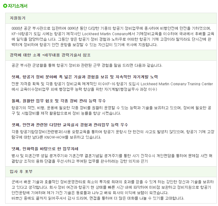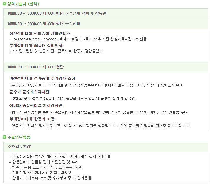 | [제대군인지원센터] 공군 부사관 이력서 샘플 (지원분야 : 항공정비) (0) | 2021.04.29 |