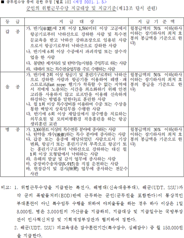 군인의 위험근무수당 지급대상 및 지급기준(제13조 단서 관련)