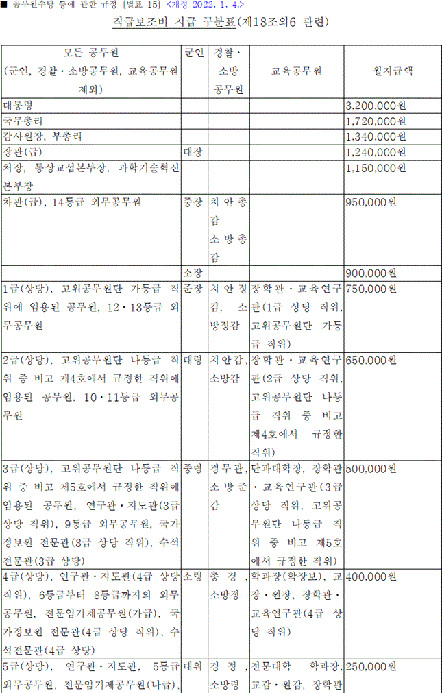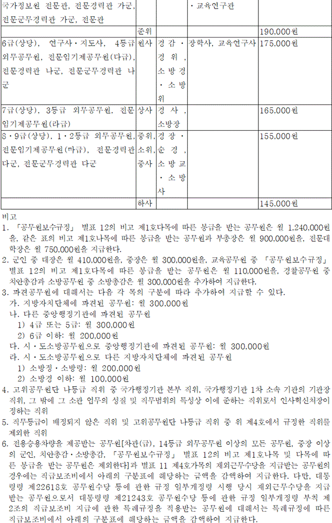 | [2023년][공무원 봉급표] 일반직공무원과 일반직에 준하는 특정직 별정직 공무원 등의 봉급표 (0) | 2023.01.13 |