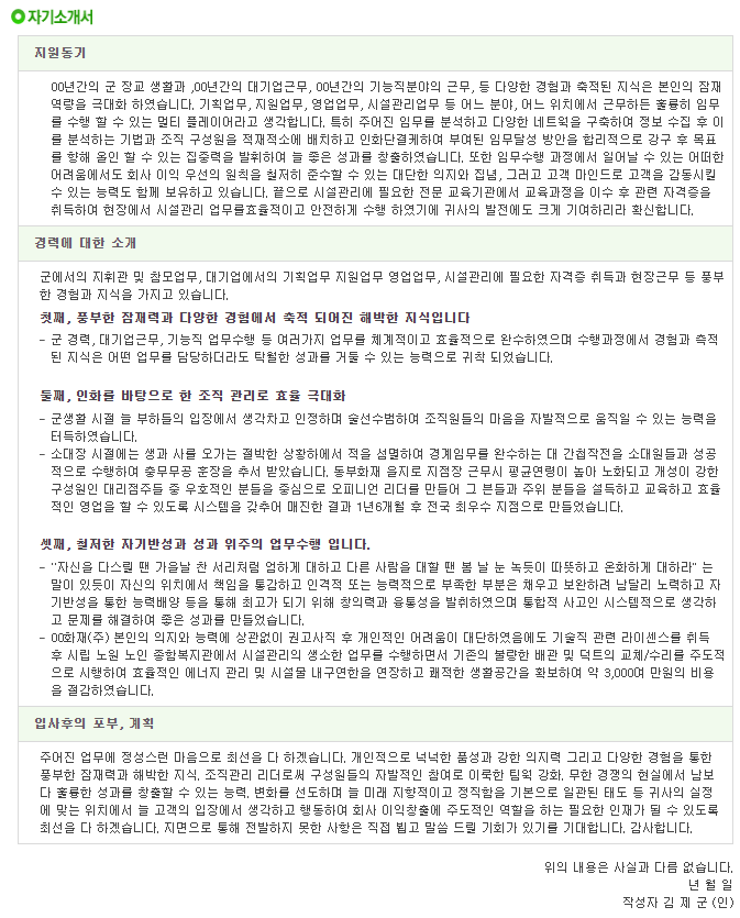 | [제대군인지원센터] 이력서 샘플(현장소장/공사관리/시설관리) (0) | 2021.04.28 |